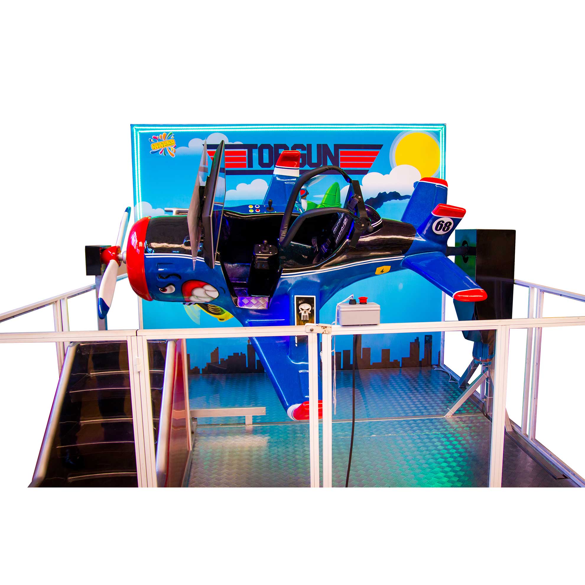 Simulador de voo individual com movimentos que chegam a 360 graus, de fácil operação, muita segurança com trava de segurança revestida com couro e cinto de segurança secundário, muita sofisticação e muita iluminação em LED.